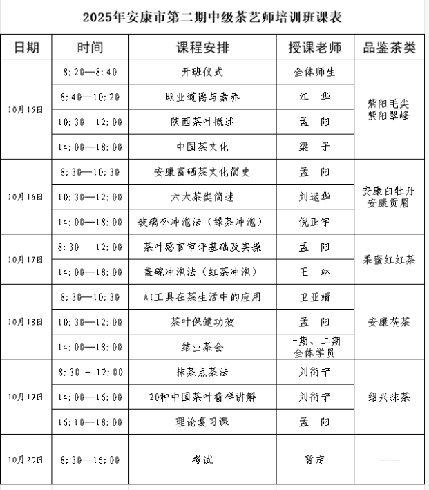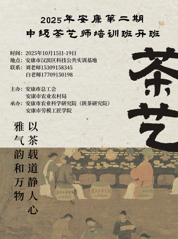 为深入贯彻习近平总书记来陕考察重要讲话重要指示精神,落实陕西省委书记赵一德同志在中国国际茶文化研究会茶文化五进工作经验交流会上的指示要求,为陕西振兴茶科技、复兴茶文化、打造茶产业新质生产力高地储备人才,由安康市总工会、安康市农业农村局主办,安康市农业科学研究院(陕茶研究院)、安康市劳模工匠学院承办的2025年安康市第二期中级茶艺师培训班即将开班。有关事项通知如下: