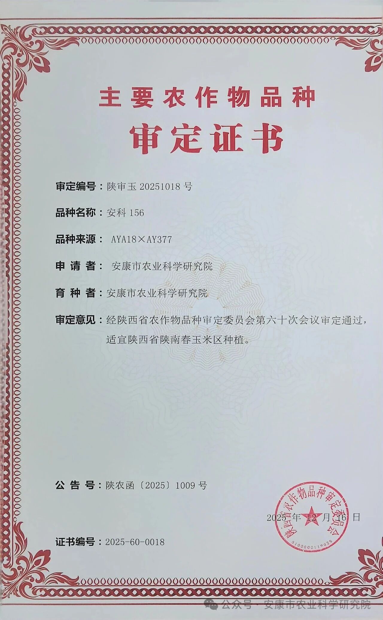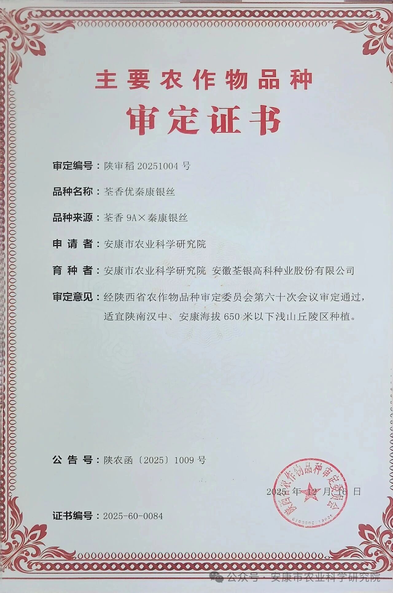 近日,陕西省农业农村厅公布陕西省第六十次农作物品种审定结果名单,安康市农科院自主选育的水稻新品种‘原香优秦康银丝’‘荃香优秦康银丝’和玉米新品种‘安科156’通过审定,为陕南秦巴山区粮食生产提质增效提供了优质种源支撑。